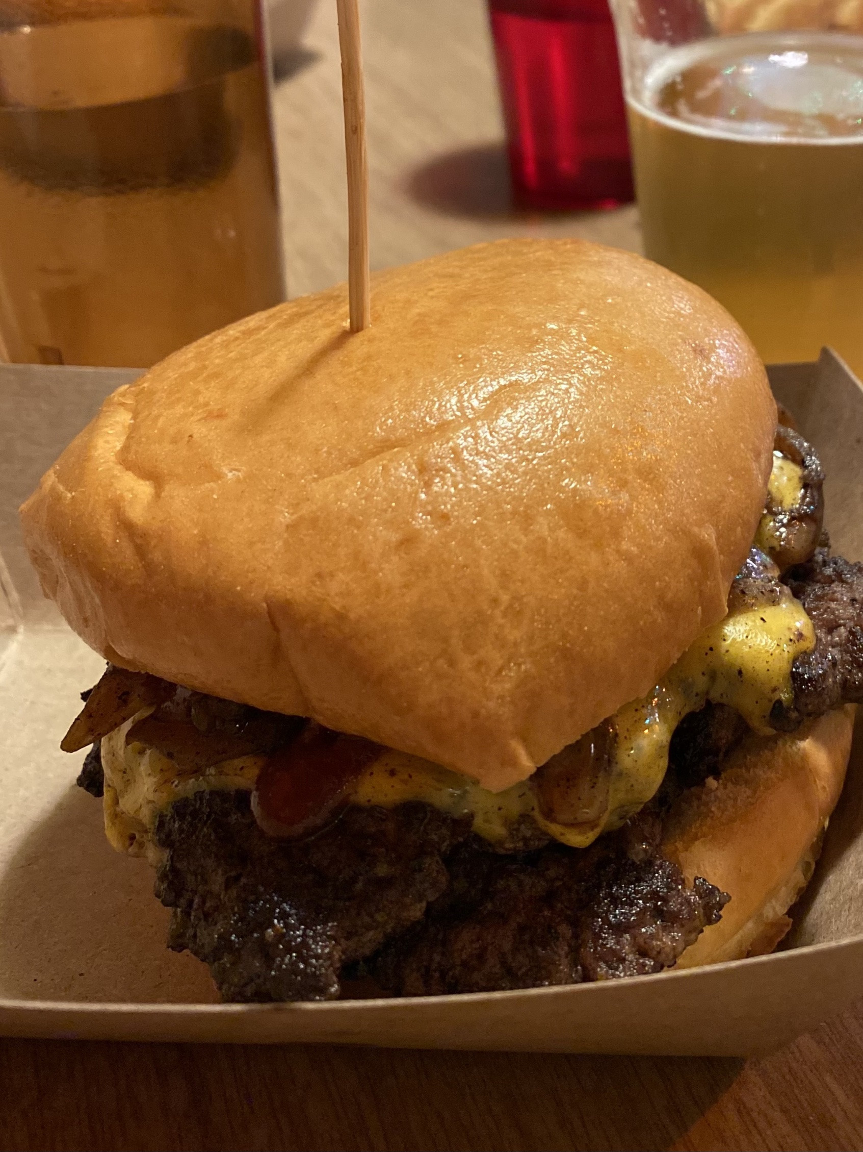 - Assemble two patties on top of each other on buns and cover with your favorite condiments (traditionally smash-burger sauce is a combo of mayo/ketchup/mustard/relish, but you do you!)